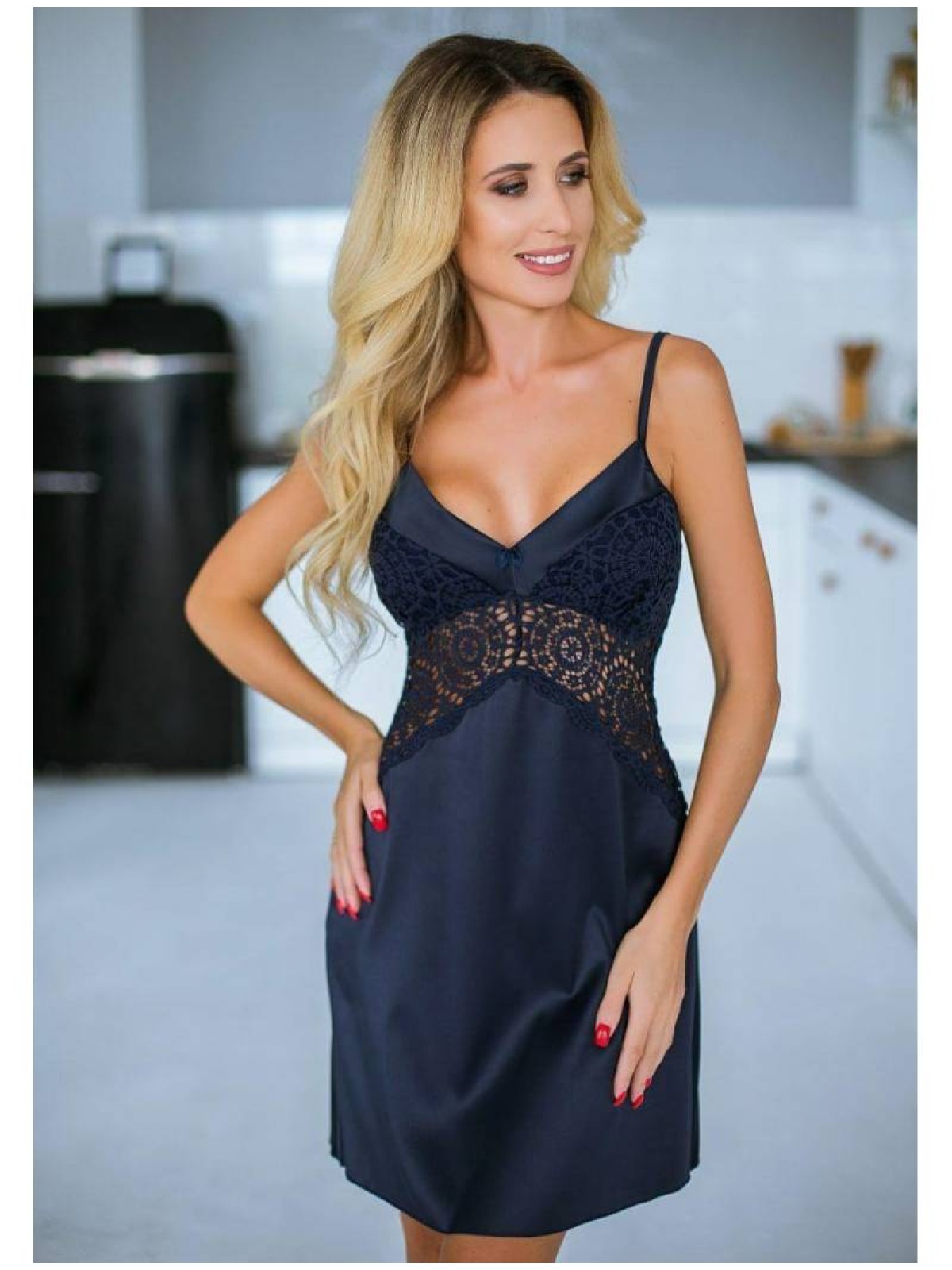 Model na cienkich, regulowanych ramiączkach wykonany jest z wysokiej jakości jedwabistego poliestru, który przyjemnie otula ciało. Główną ozdobą jest luksusowa koronka z dodatkiem naturalnej nici wiskozowej. W okolicy biustu koronka została podszyta miękką wiskozą w kolorze tkaniny, co zapewnia komfort i estetyczny wygląd. Szeroka koronkowa wstawka pod biustem efektownie podkreśla sylwetkę, dodając elegancji i tworząc wyjątkową domową przytulność.