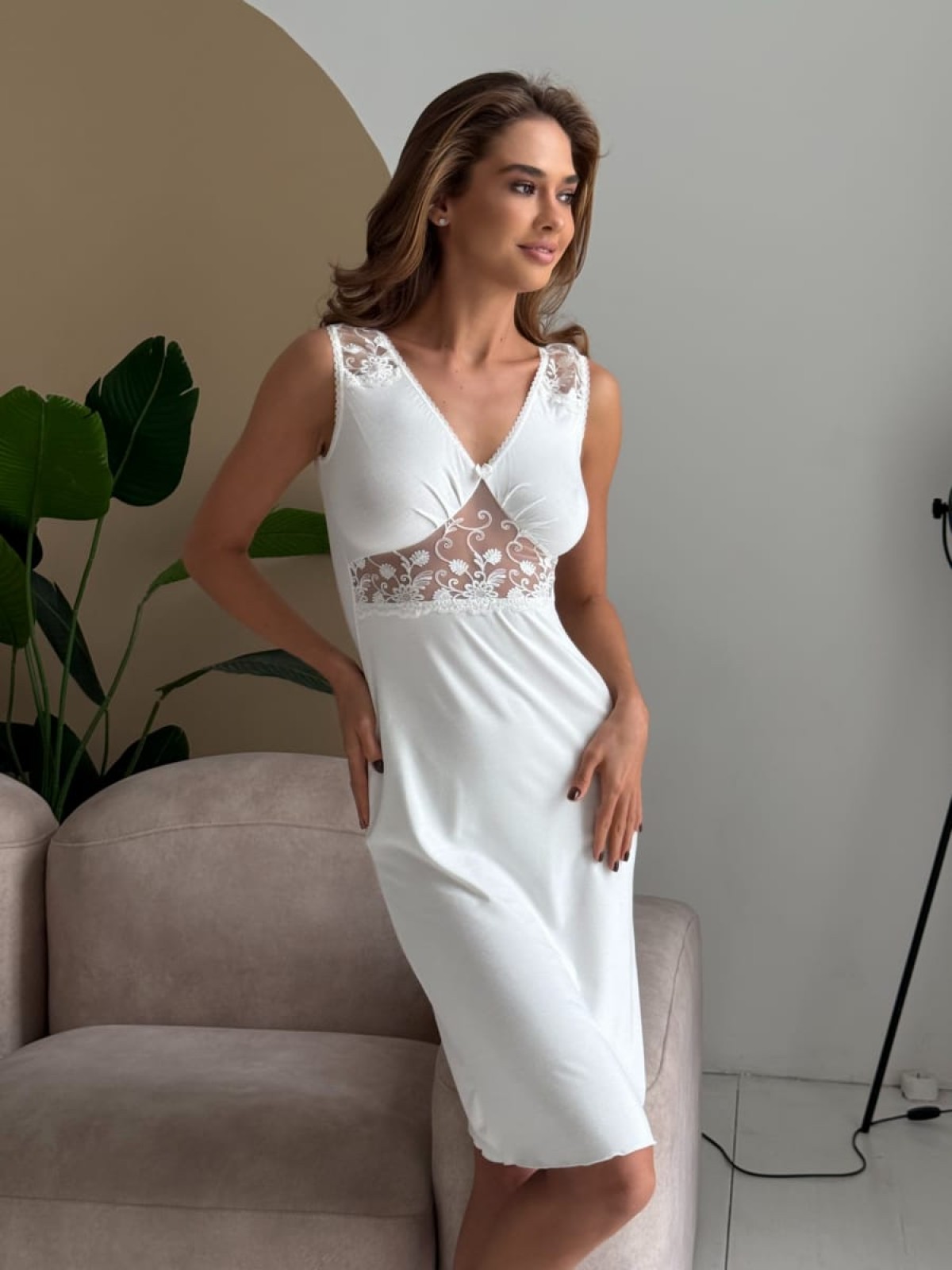 Ten model zachwyca swoją finezją: koronkowe ramiączka płynnie przechodzą w głęboki dekolt w serek (V-neck), nadając stylizacji wyjątkowego uroku. Głównym atutem jest szeroka wstawka z półprzezroczystej koronki pod biustem, która efektownie podkreśla sylwetkę. Koszula wykonana jest z miękkiej naturalnej wiskozy, która delikatnie otula ciało, zapewniając swobodę ruchów i prawdziwą domową przytulność.