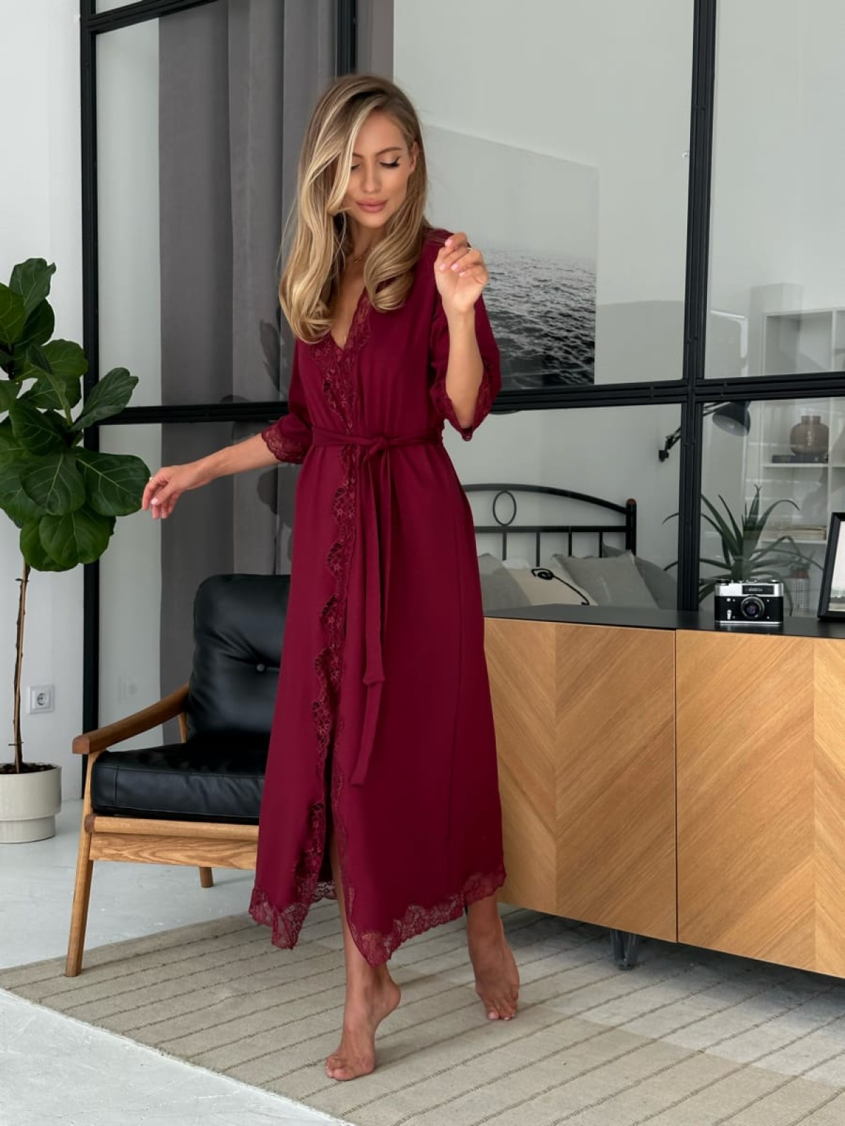 Zanurz się w świecie wyrafinowanego komfortu i tajemniczego piękna z długim szlafrokiem X-M-46 Bordeaux od Violet Delux.
