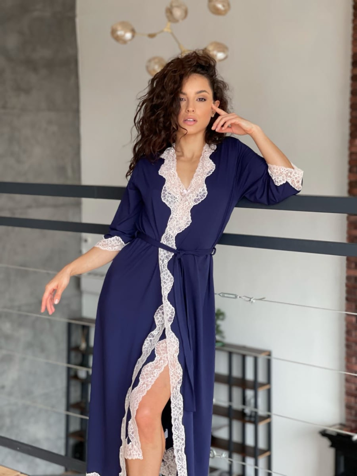 Ten elegancki szlafrok o poszerzonym kroju, o długości poniżej kolana, posiada wygodny pasek, który delikatnie podkreśla sylwetkę, oraz luksusową koronkę na kołnierzu, brzegach i rękawach.