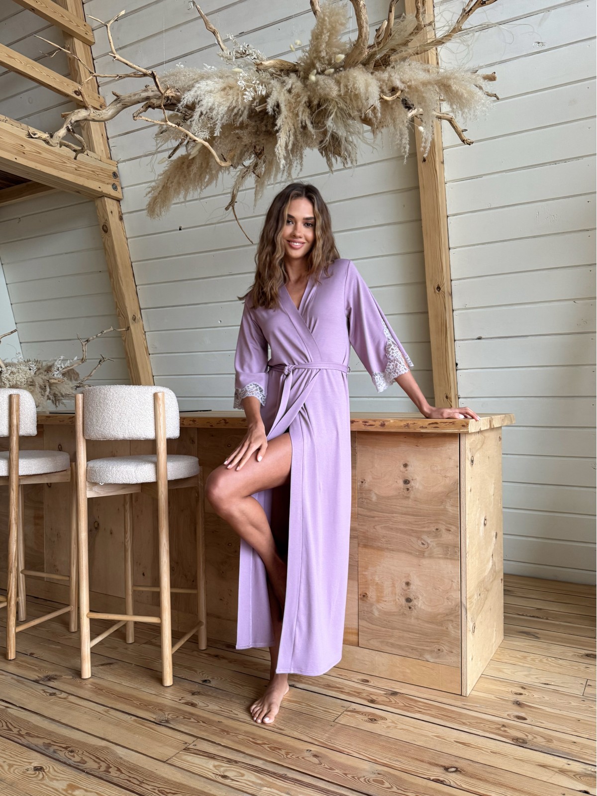 Model wykonany jest z wysokiej jakości naturalnej wiskozy, która miękko otula sylwetkę, zapewniając niezrównane poczucie komfortu i lekkości. Głównym akcentem szlafroka są luksusowe rękawy 3/4, ozdobione wyrafinowaną szeroką koronką z kuszacymi rozcięciami, które nadają całości wyjątkowego uroku. Klasyczny fason z paskiem podkreśla talię, tworząc subtelny i szlachetny wygląd.
